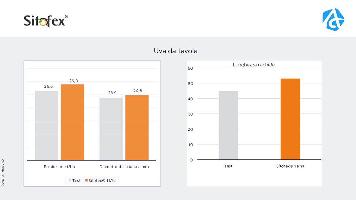I risultati ottenuti in Sicilia da una prova svolta nel 2024 su una cultivar apirena, ha confermato che Sitofex® permette di ottenere effetti positivi su diversi parametri: incremento della dimensione degli acini, buccia più spessa, rachide più lungo e robusto e migliore tenuta degli acini al peduncolo. Anche in questo caso, caratteristiche qualitative come colore e grado Brix°, non hanno subito variazioni statisticamente significative.