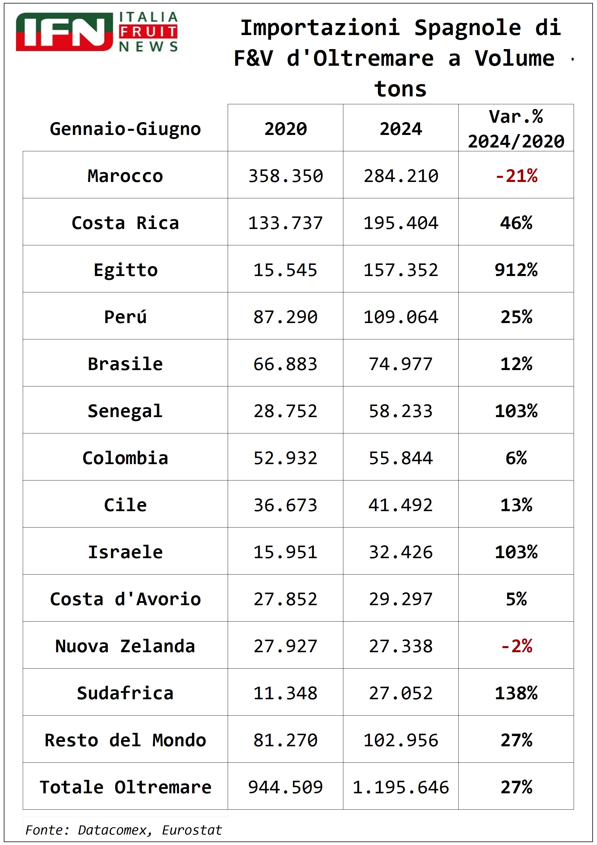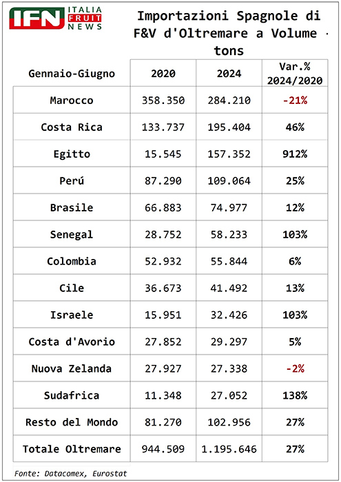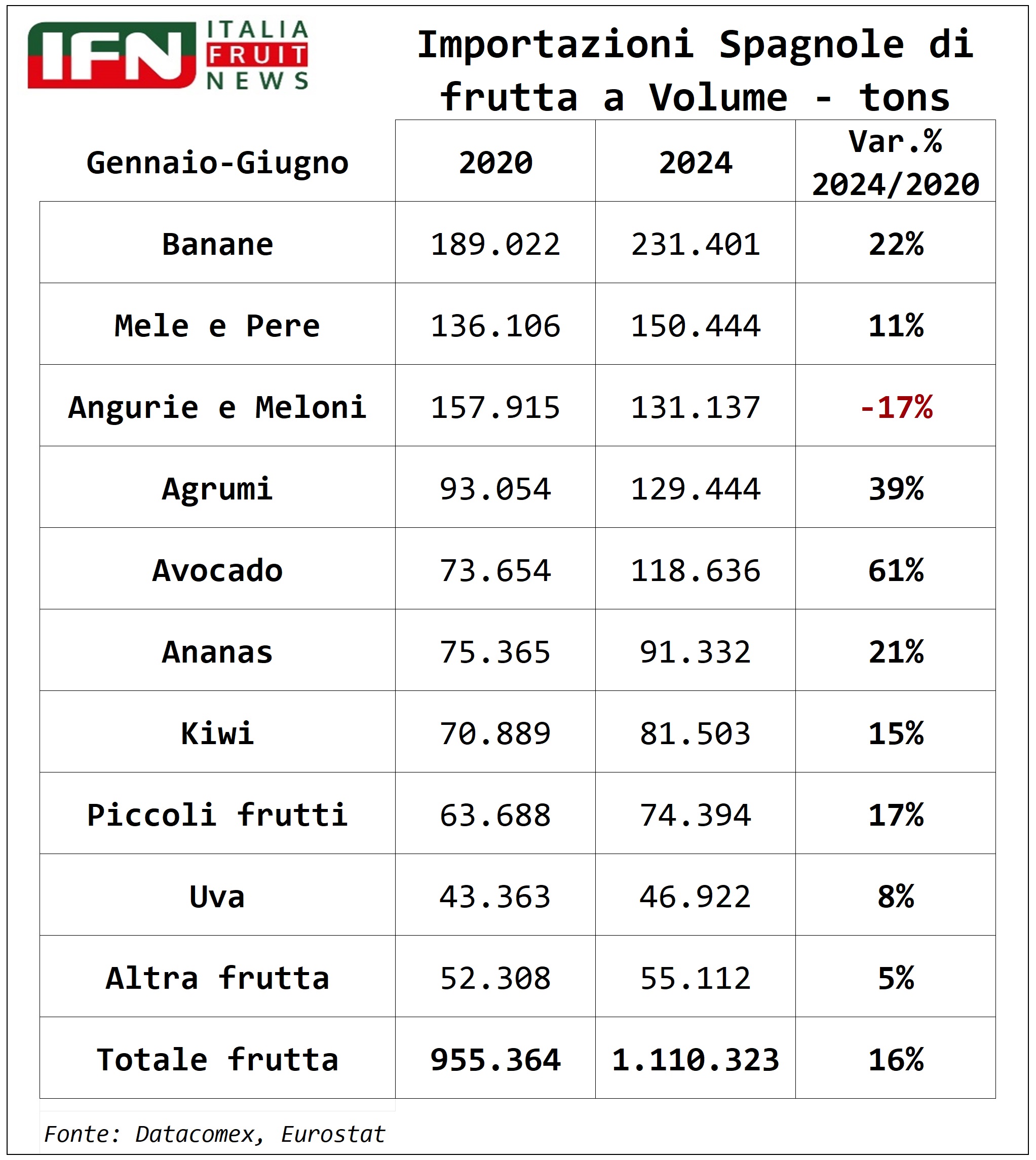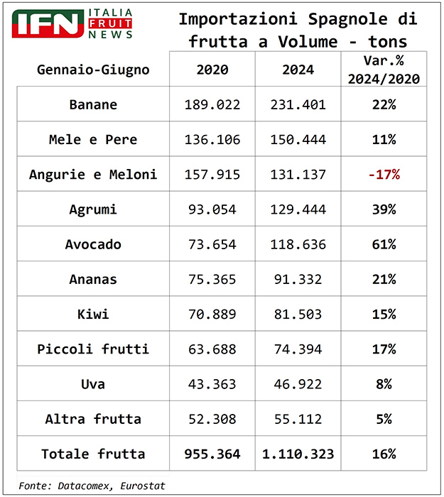 Il caso più significativo riguarda l’avocado, che segna in cinque anni un incremento delle importazioni a volume di oltre il 60%, giustificato – da una parte – con l’aumento dei consumi (la Spagna è fra i più grandi estimatori europei di questo frutto) e, soprattutto, dalle ri-esportazioni, che valgono circa il 60% di quello che viene importato. Da sottolineare che, proprio nel primo semestre dell'anno, è disponibile anche la produzione spagnola di avocado, per cui, evidentemente, questa non riesce a far fronte ai consumi interni e alle richieste dei mercati esteri, a partire dal vecchio continente, dove gli operatori spagnoli si stanno conquistando una leadership significativa.