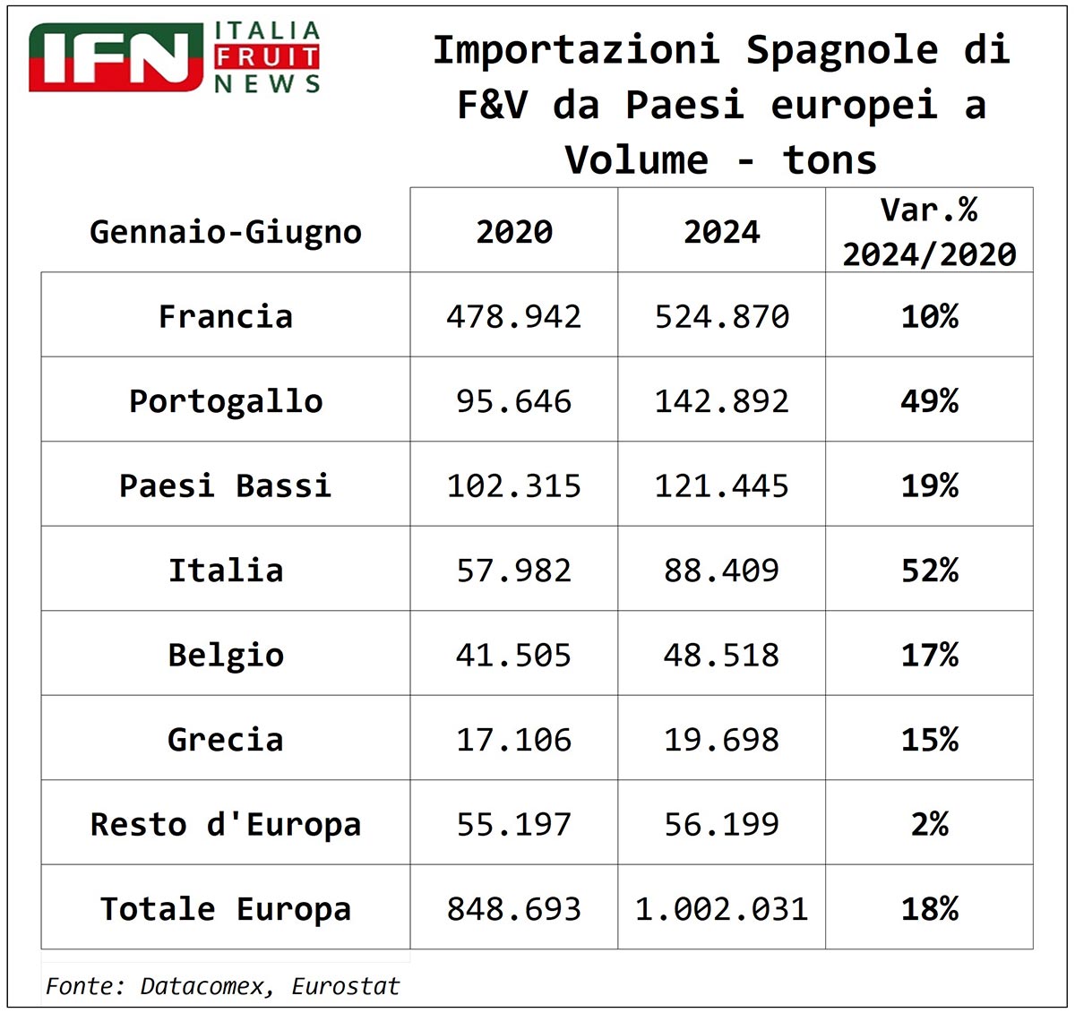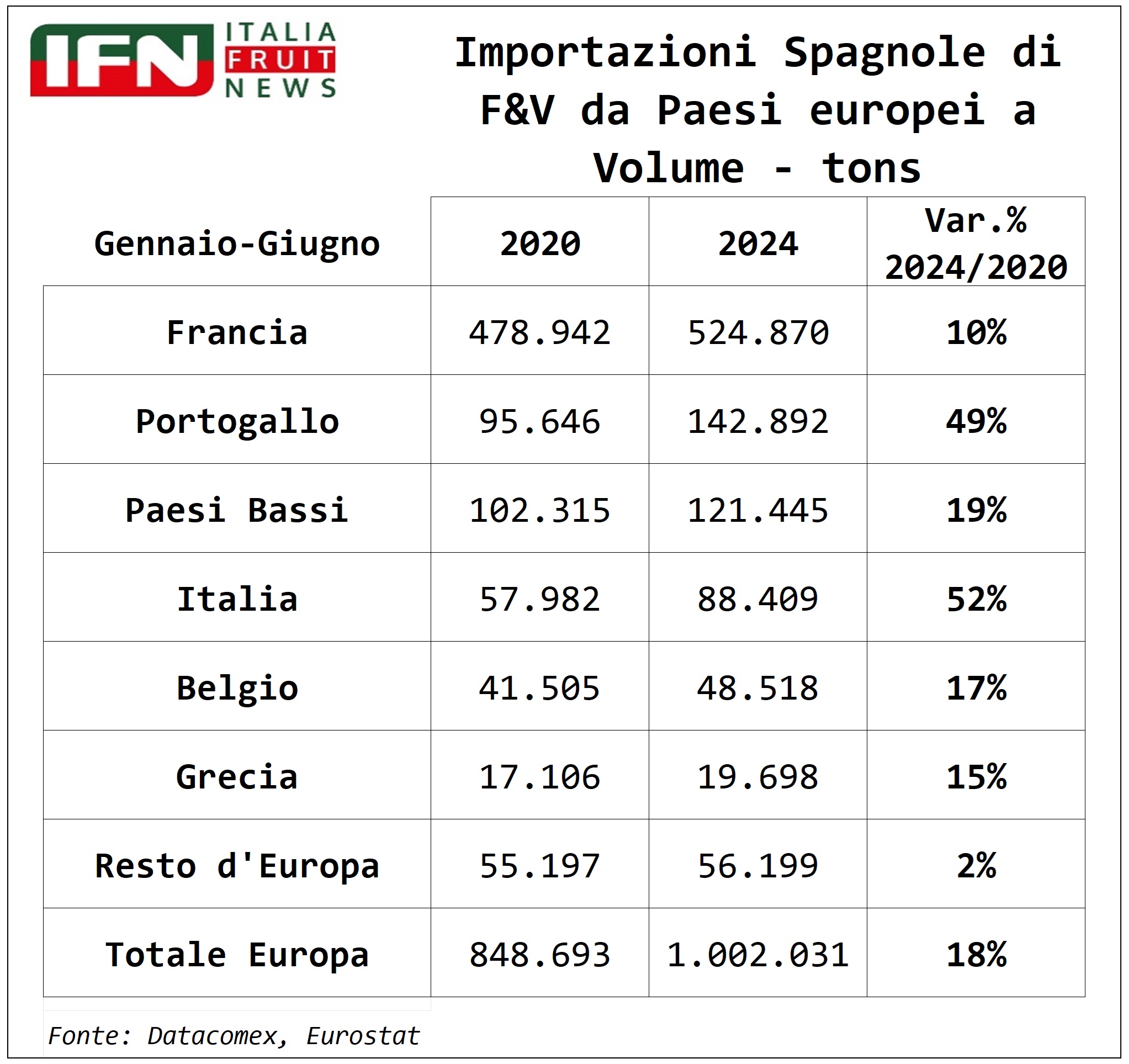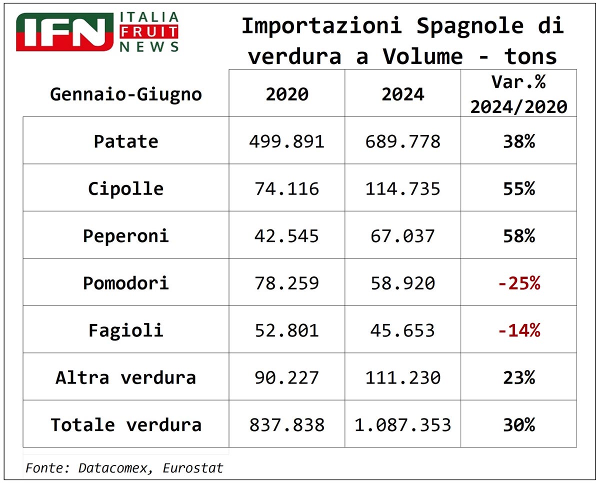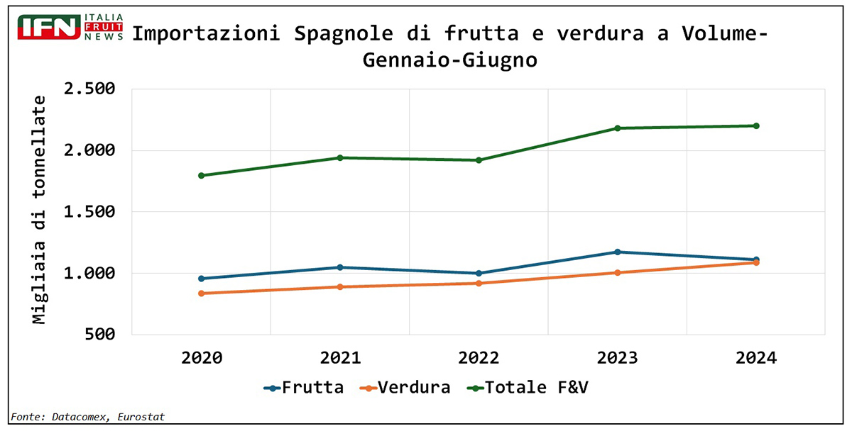 Nei primi sei mesi di quest’anno le importazioni spagnole continuano a crescere (+1% a volume), confermando il trend degli ultimi 5 anni, che ha mostrato un incremento complessivo superiore al 20%. In particolare, gli ortaggi mostrano una progressione costante, mentre la frutta vive di alti e bassi.