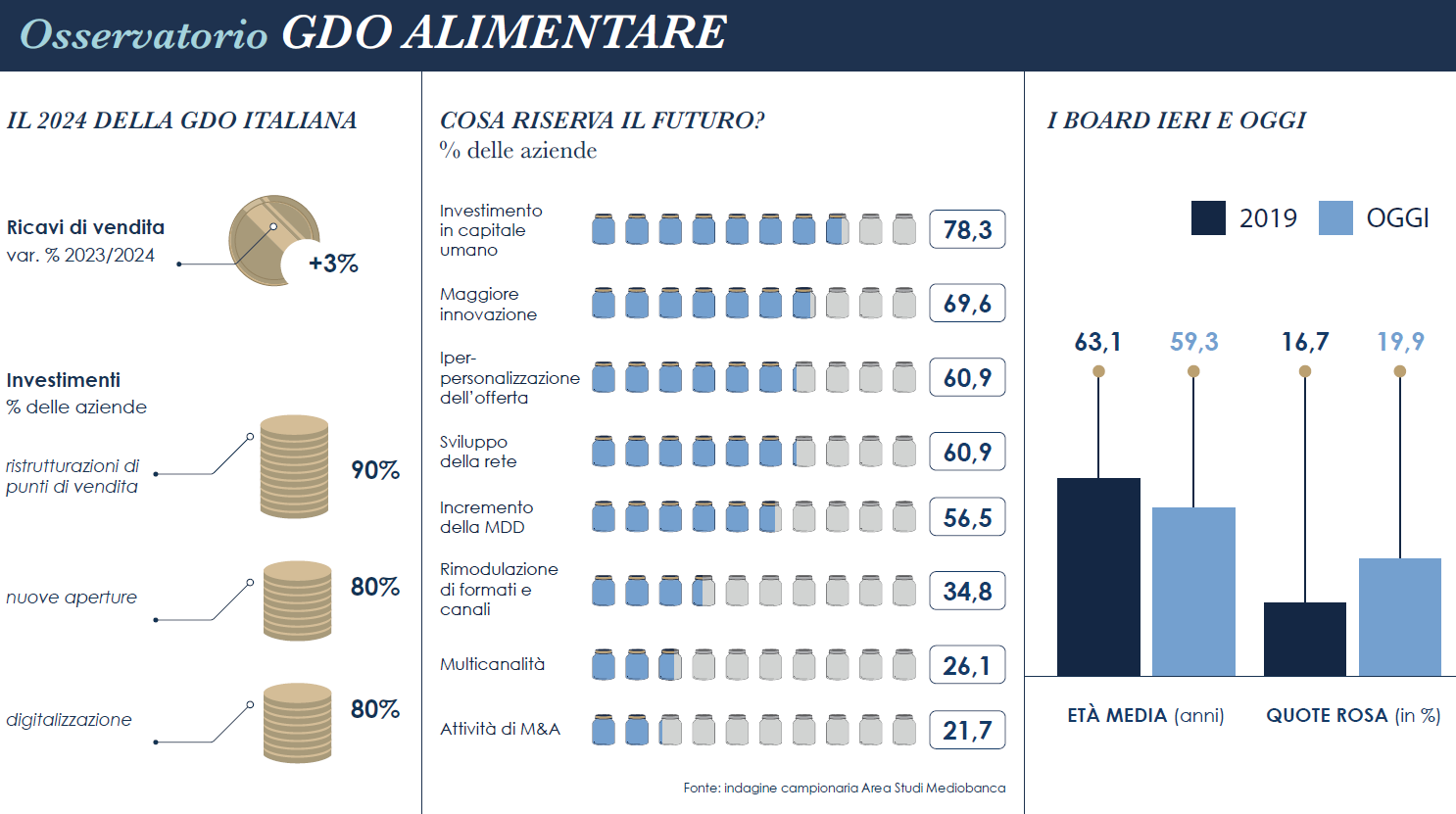 Dal confronto è emerso come la distribuzione organizzata nazionale a matrice familiare abbia avviato oramai da tempo processi di modernizzazione dell’assetto finanziario e della governance che hanno permesso di rendere più solidi i gruppi, ad esempio con la costituzione di holding dedicate, e garantire l’accesso di manager che hanno coadiuvato il vero punto di forza iniziale di queste imprese: la passione dell’imprenditore. Da imprese padronali a imprese familiari managerializzate. In questo modo anche il passaggio generazionale, che costituisce un problema rilevate nella maggior parte delle imprese familiari può risultare più fluido e le quote rosa possono svilupparsi in modo coerente con le esigenze di inclusione.