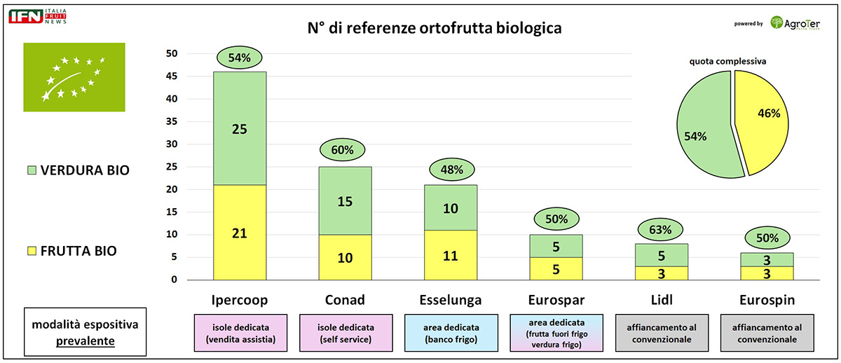 Analizzando la suddivisione tra frutta e verdura, emerge una leggera prevalenza delle referenze orticole, che rappresentano complessivamente il 54% dei prodotti rilevati. Questo dato varia leggermente nei punti vendita con assortimenti intermedi: ad esempio, Conad raggiunge il 60% di verdura, mentre Esselunga si attesta al 48%.