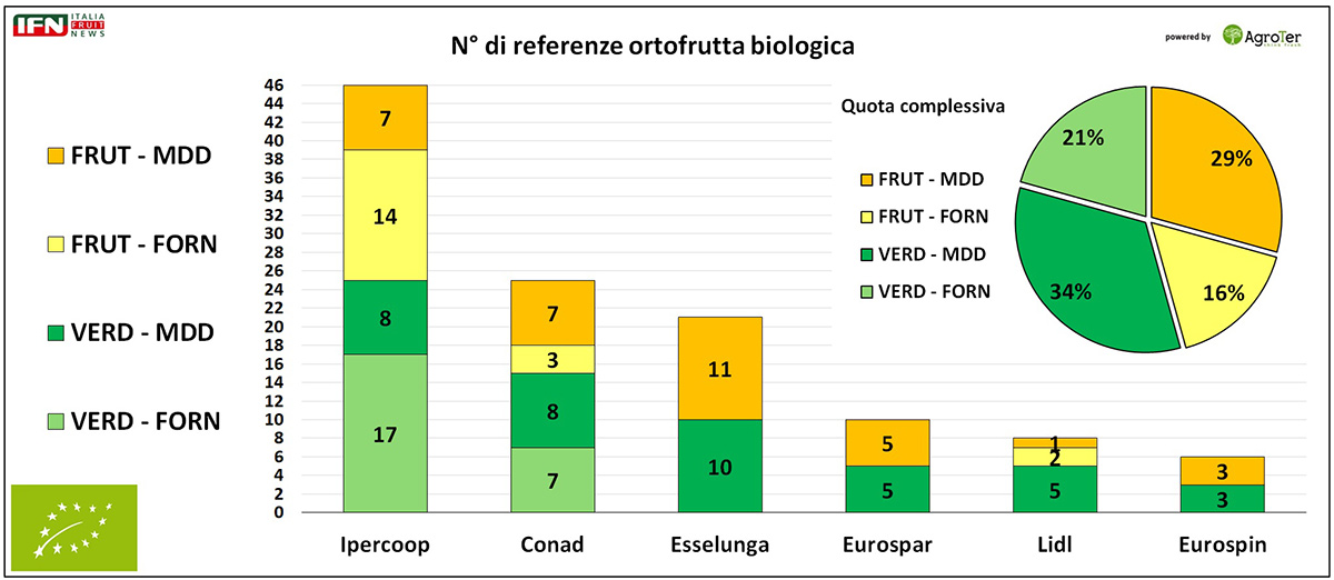 Nel complesso, la Mdd domina in termini numerici, rappresentando il 63% delle referenze totali: il 29% nel comparto frutta e il 34% in quello della verdura.