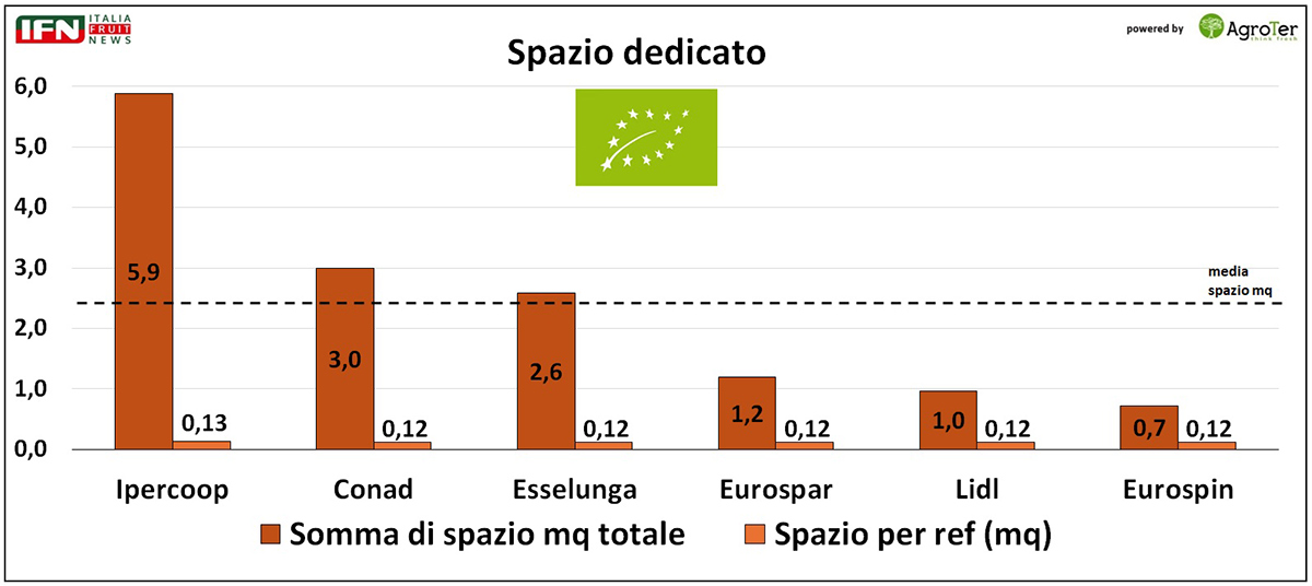 Sicurezza e fiducia restano elementi chiave nel processo d’acquisto: pur essendo i principali driver del consumo dell’ortofrutta biologica, non sembrano però sufficienti a determinare una crescita significativa delle vendite, almeno non in tutte le categorie. Ma, come detto, gli elementi che entrano in gioco sono molteplici e le strategie delle diverse insegne risultano molto differenti, non solo nelle numeriche o nelle scelte assortimentali e dei marchi, ma anche nelle modalità espositive e nelle fasce prezzo. Di certo, è evidente un’attribuzione di spazio medio per referenza inferiore rispetto alla media delle categorie analizzate in passato.