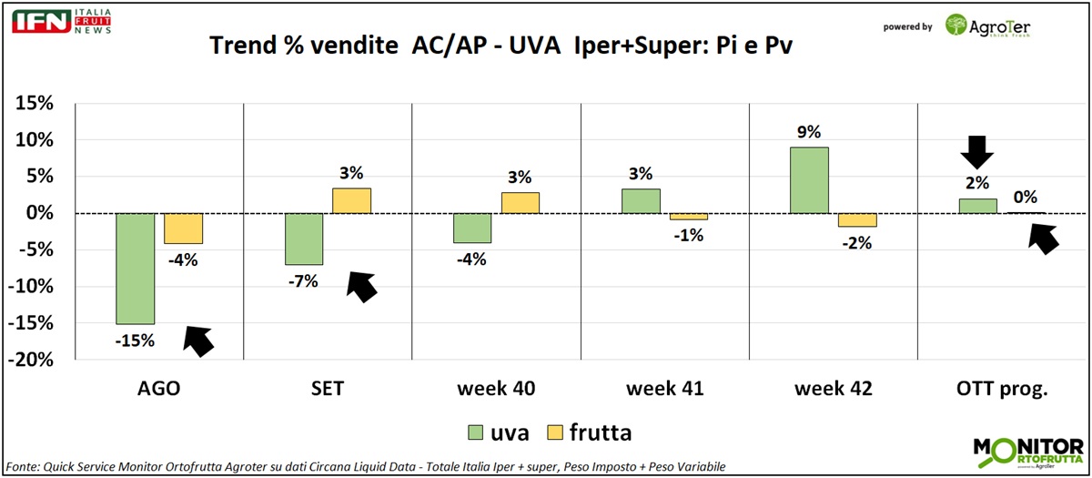 Ad ottobre, la campagna dell’uva da tavola è ancora nel vivo, considerando che sviluppa circa un quinto dei volumi complessivi nel canale di ipermercati e supermercati. Tuttavia, l’avvio non è stato sicuramente dei migliori: ad agosto i volumi sono calati del -15% rispetto all'anno precedente, così come a settembre, anche se di con intensità inferiore (-7% a volume). Le situazione migliora solo a partire dalla seconda settimana di ottobre, quando le vendite riprendono fiato (+3% a volume), favorite da una deflazione marcata (-11%). Il trend positivo si consolida nella settimana 42, con prezzi ancora in calo (-14%) e volumi in crescita (+9%). Nonostante ciò, il bilancio a valore del mese rimane negativo (-7%).