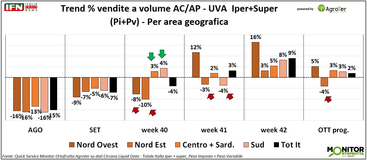 Passando alla distribuzione geografica dei consumi, si osservano alcune marcate differenze fra Nord e Centro-Sud Italia. Dopo un agosto e un settembre caratterizzati entrambi da trend a volume per l’uva da tavola trasversalmente negativi lungo lo Stivale, all’inizio di ottobre – nella week 40 - i volumi crescono al Centro-Sud (+3/4%) e continuano a flettere al Nord (-8/10%). Successivamente, nella settimana 41, si osservano andamenti a singhiozzo, con un Nord Ovest che va in doppia cifra (+12%), ma il Sud che si riduce (-4%), per poi registrare trend tutti positivi nell’ultima week analizzata, la 42. Nel complesso, il progressivo a ottobre mostra trend positivi, a parte al Nord Est (-4%). (bf)