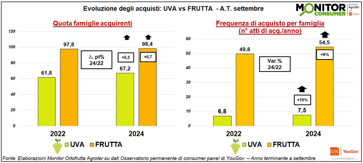 Le famiglie che acquistano uva da tavola sono aumentate tra il 2022 e il 2024 (+5,3 punti) e in modo più che proporzionale rispetto alla frutta in generale (+0,7 punti). A livello di frequenza di acquisto, invece, la crescita è sostanzialmente speculare tra uva (+10%) e frutta (+9%).