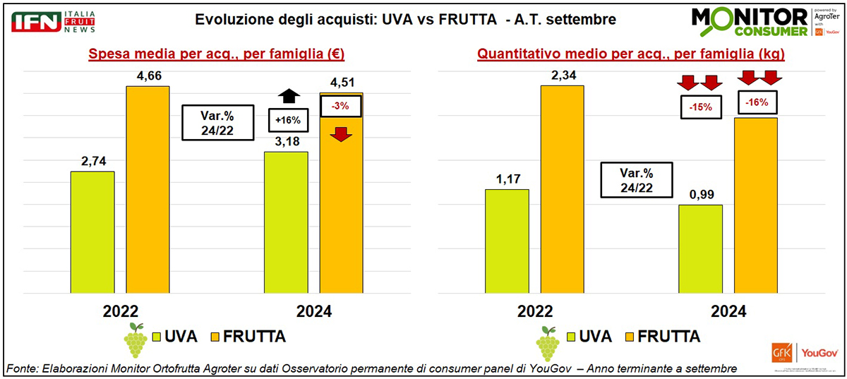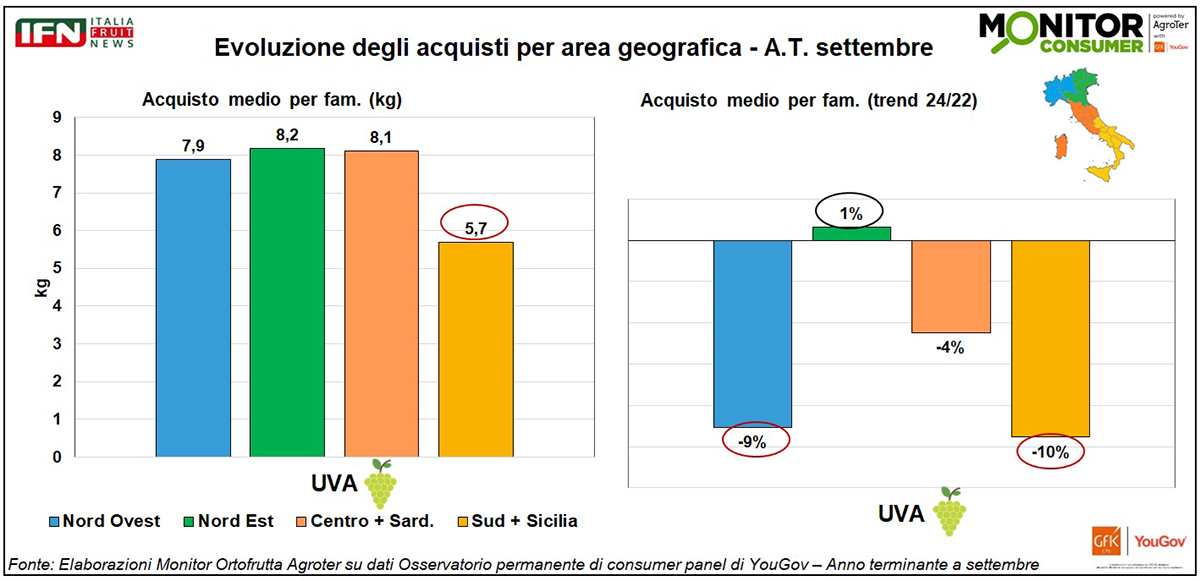 Analizzando il comportamento d’acquisto, emerge che le famiglie italiane hanno adottato un approccio più oculato, riducendo i quantitativi medi acquistati in linea con la tendenza generale della frutta (-15% e -16%). Tuttavia, hanno aumentato sensibilmente la spesa per l’uva (+16%), a fronte di un calo per la frutta in generale (-3%). Questo evidenzia come i consumatori abbiano orientato i propri acquisti verso categorie specifiche, tra cui l’uva spicca in modo particolare.