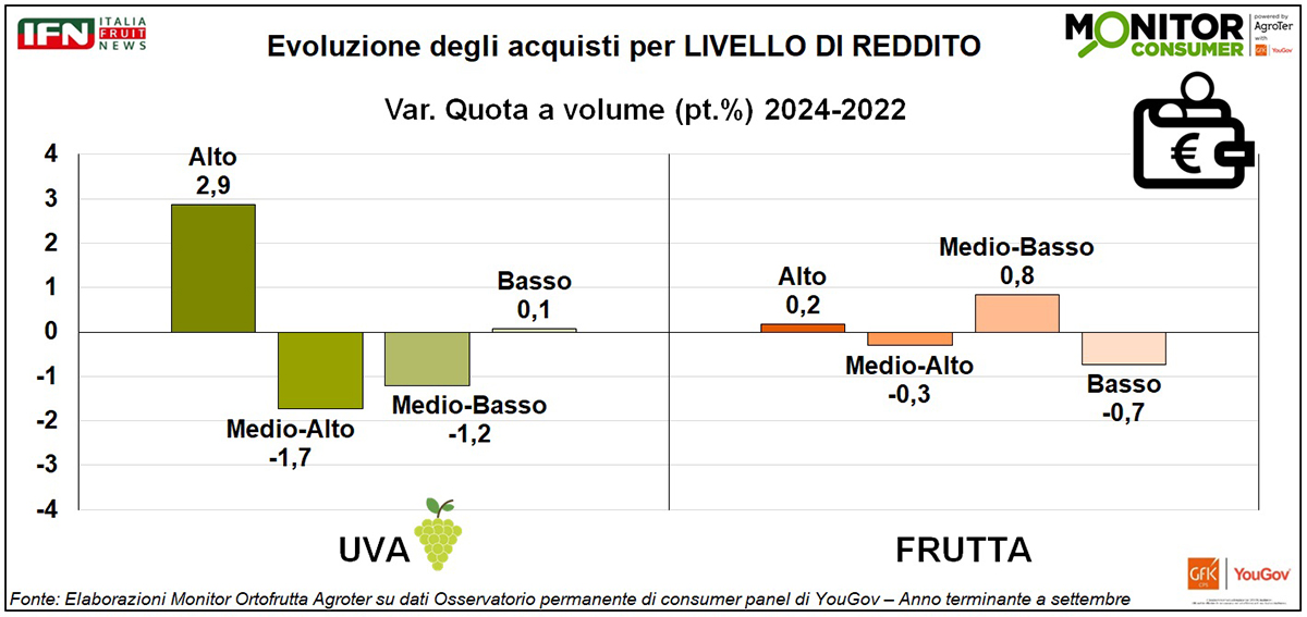 L’aspetto più interessante riguarda l’evoluzione delle quote di acquisto, con una netta crescita nella fascia di reddito alto, che guadagna quasi 3 punti percentuali, a fronte di una sostanziale stabilità per la frutta in generale (+0,2 punti). Al contrario, le fasce di reddito intermedie segnano un calo per l’uva (-1,7 punti per la fascia medio-alta, -1,2 punti per la medio-bassa), mentre la fascia più bassa resta stabile.