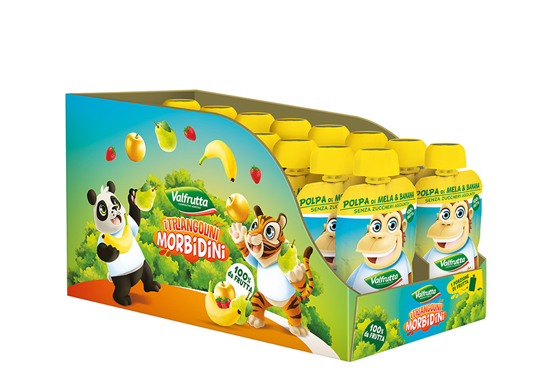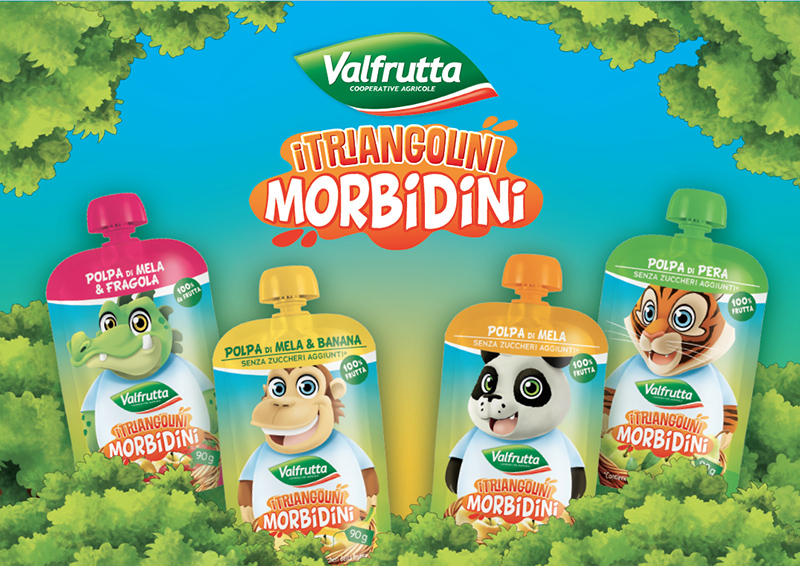 Pensa ai giovanissimi e presenta I TRIANGOLINI MORBIDINI, la grande novità 2024 nelle polpe di frutta dedicate ai più piccoli. Da oggi la qualità della migliore frutta selezionata e garantita da VALFRUTTA viene proposta in una confezione DOYPACK da 90gr. Ma nei TRIANGOLINI MORBIDINI c’è anche tanto divertimento, con molti simpatici personaggi provenienti dal mondo dei TRIANGOLINI, da collezionare giorno per giorno.