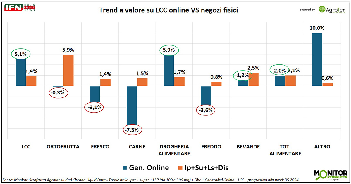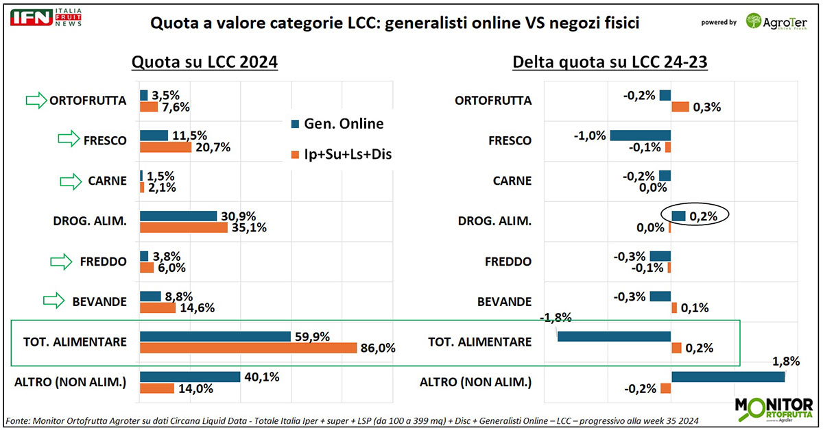 All’interno di questo mercato, i generalisti online - come Amazon, i siti dei supermercati e i servizi di consegna rapida - rappresentano il 2,4% del valore dell’LCC da gennaio ad agosto 2024. Tuttavia, si notano grandi differenze tra le diverse categorie, soprattutto rispetto ai negozi fisici.