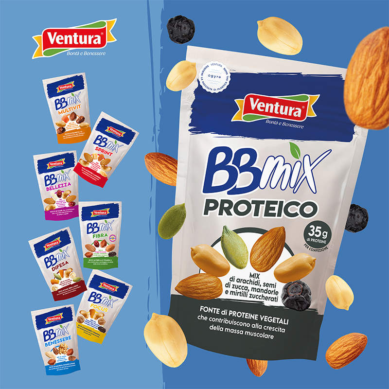 Alla base della filosofia Ventura c’è la passione per la selezione della migliore frutta secca e per la valorizzazione delle sue proprietà nutrizionali, con l’obiettivo di promuovere buone e sane abitudini alimentari. La linea Ventura BBmix nasce dall’incontro tra competenza, ricerca e gusto, dando vita a mix equilibrati, piacevoli e pensati per target diversi, con esigenze nutrizionali differenti.