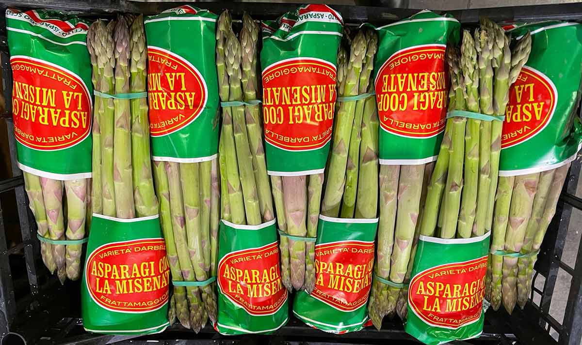 Vera e propria novità del periodo sono gli asparagi campani in mazzi (calibro 16/20), che sono venduti a 7,50/ 8,50 euro al chilogrammo, mentre quelli bianchi peruviani via aerea raggiungono i 9/11 euro al chilogrammo ma si tratta di quantitativi molto limitati. “Tra 20 giorni entrerà nel vivo la campagna italiana con asparagi da Campania, Puglia e Sicilia”.