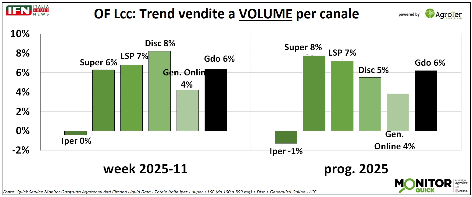 Nella settimana 11, l’ortofrutta a peso imposto continua a registrare ottimi risultati, con performance costantemente superiori rispetto all’Lcc. Anche l’analisi per canale mostra segnali positivi su tutta la linea: in particolare, il discount si distingue per i migliori trend a volume, mentre l’ipermercato torna in equilibrio dopo alcune settimane di difficoltà.