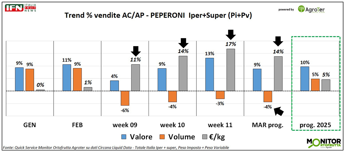 L’aumento del prezzo medio mix nei peperoni impatta sulle vendite, soprattutto nello sfuso