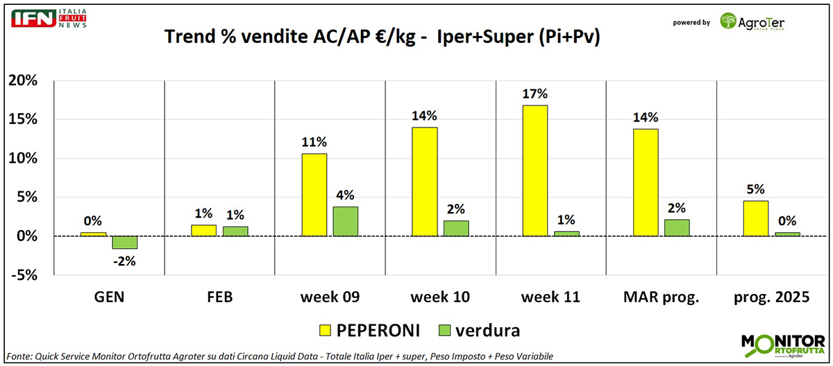 Il confronto con l’andamento generale della verdura rende il quadro ancora più critico per i peperoni. A livello complessivo, infatti, non si osservano variazioni significative nel prezzo medio mix, a differenza di quanto accade per questa specifica categoria. Una dinamica inflattiva che ha inciso in maniera evidente sui peperoni, contribuendo probabilmente a rallentare i consumi.