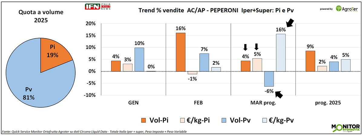 Un’analisi più approfondita della categoria evidenzia dinamiche differenti tra il prodotto confezionato a peso imposto e quello a peso variabile, generalmente sfuso, che rappresenta oltre l’80% dei volumi. Nel progressivo di marzo, i peperoni a peso imposto mostrano un aumento contenuto del prezzo medio mix (+5%), accompagnato da una crescita dei volumi del +4%. Diverso il quadro per il peso variabile, dove il prezzo medio mix segna un’impennata del 16%, con un conseguente calo degli acquisti a volume del 6%.