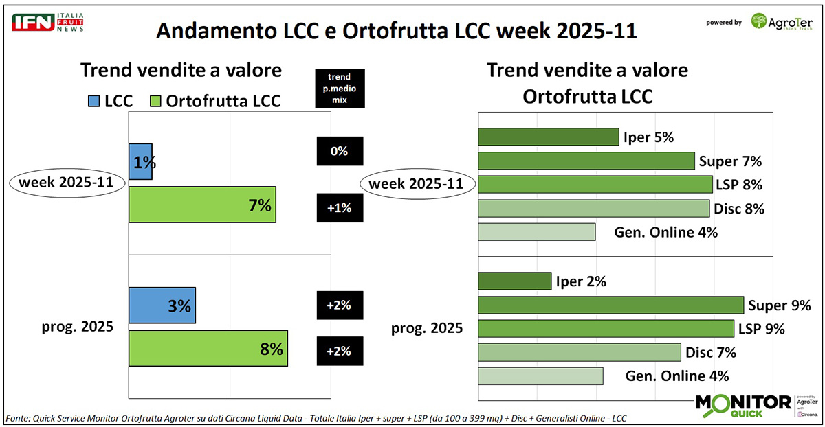 La week 11, che chiude la prima metà di marzo, segna un’accelerazione per l’ortofrutta a peso imposto, con una performance a valore in crescita del 7%, in miglioramento rispetto al +5% della settimana precedente, già in scia positiva. L’aumento del prezzo medio mix resta contenuto (+1%), confermando una dinamica positiva anche in termini di volumi. Il risultato risulta nettamente superiore rispetto all’Lcc (+1%), con trend solidi e confortanti trasversalmente a tutti i canali.