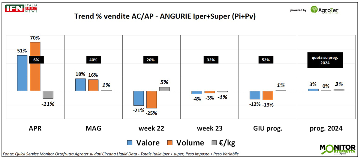 Guardando queste immagini, sembra che ci sia stata una correlazione precisa tra aumento delle temperature ad aprile e a maggio 2024, e anche i trend di vendita delle angurie lo confermano. Giugno 2024, però, non è stato un mese disastroso come meteo, in generale, ma i trend delle angurie sono in flessione, forse perché giugno 2023 era stato molto sopra media. Per completare l’analisi, rimandiamo alle prossime uscite con i dati completi di giugno sia a livello di vendite che di temperature.