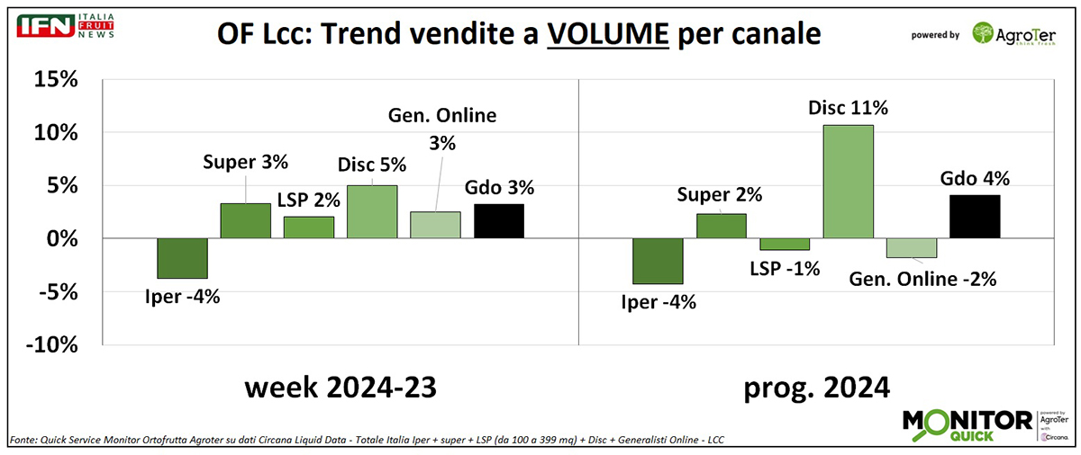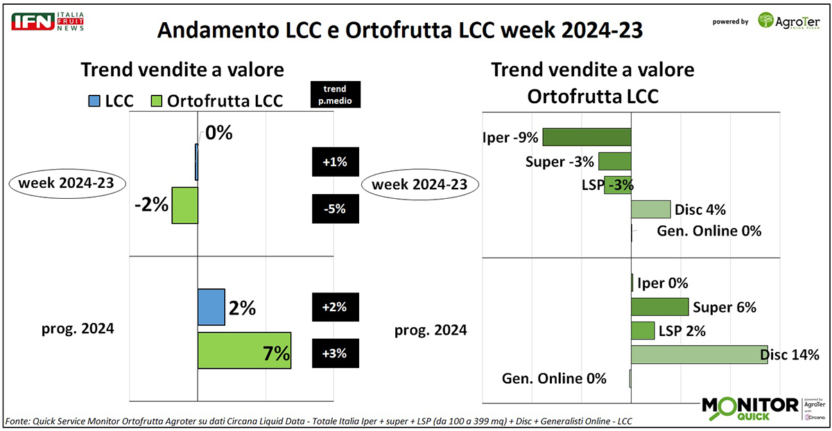 Nella settimana 23 l’ortofrutta a peso imposto aumenta i volumi venduti, ma la deflazione porta le vendite a valore in negativo. Nell’Lcc, invece, le vendite tengono. Tra i canali, è ancora il discount che performa meglio di tutti e, come variazione dei prezzi, è quello che registra la minore deflazione.
