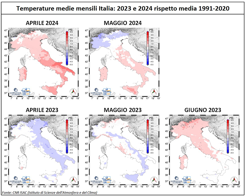Guardiamo, ad esempio, aprile: nel 2024 le temperature nazionali sono state superiori al periodo di riferimento, mentre nel 2023 erano state inferiori a questo un po' in tutta la Penisola (il colore rosso identifica temperature sopra la media, il blu inferiori alla media). Anche a maggio le temperature medie del 2024 sono state - in generale - superiori rispetto al 2023, anche se con un peggioramento al Nord Italia. Per giugno è disponibile solo il dato del 2023, ma osservando le temperature medie è chiaro come fosse stato un mese decisamente più caldo rispetto al periodo di riferimento.