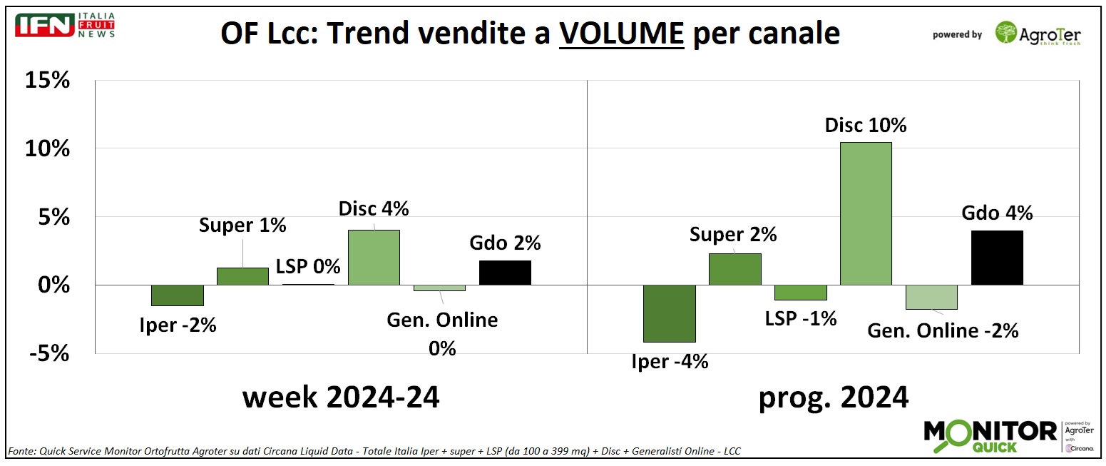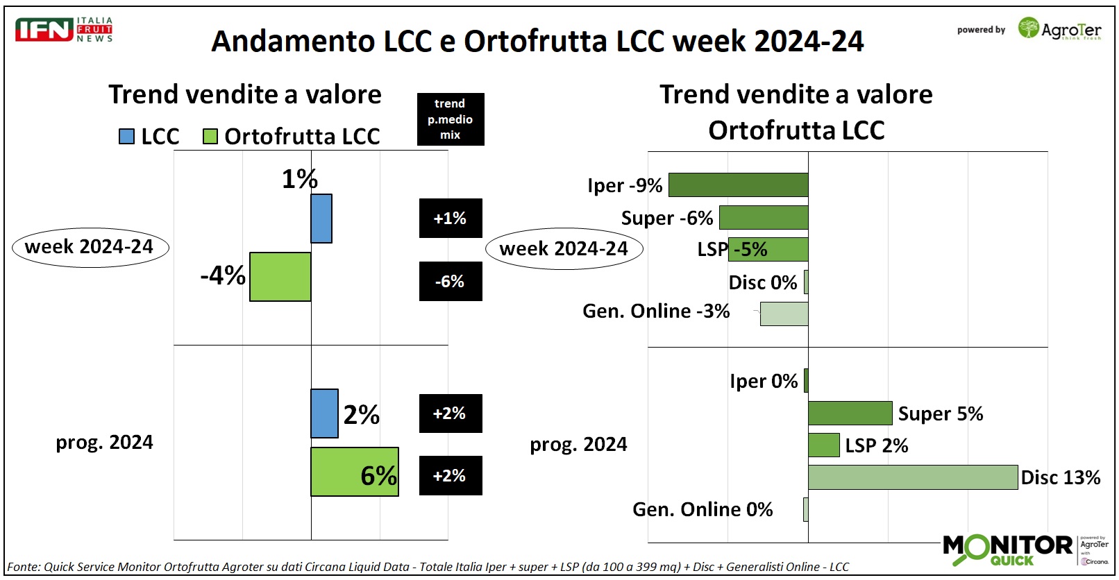 Nella week 24 aumenta la deflazione già rilevata nelle settimane precedenti; difatti i volumi dell’ortofrutta Lcc sono ancora positivi, ma le vendite a valore sono in rosso. Tra i canali, ancora testa a testa tra discount e supermercato per la migliore performance.