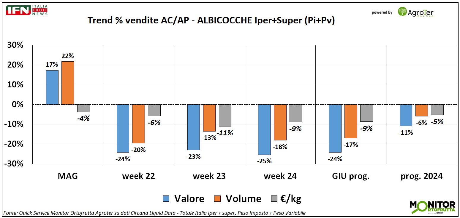 La situazione non è diversa, anzi è peggiore, se si osserva l’andamento delle ciliegie. A maggio il trend raggiungeva addirittura un +55% come vendite a volume che, però, diventa un -45% nelle prime settimane di giugno. Anche in questo caso i prezzi medi non hanno un ruolo chiave, poiché non mostrano variazioni particolari, anzi sono in lieve calo anche in questo caso (-5%). Il saldo da inizio anno è negativo (-24%) poiché il peso delle prime tre settimane di giugno (dalla week 22 alla 24) è ben superiore a quello di maggio nel complesso, e pari a circa due volte. La situazione è simile anche nelle albicocche.