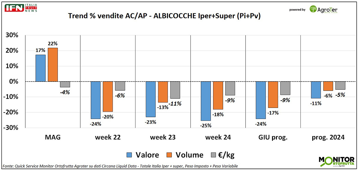 Nelle albicocche, dopo un inizio stagione positivo (maggio +22% a volume), il trend delle vendite - per ipermercati e supermercati – mostra una situazione difficile nella prima parte di giugno (dalla week 22 alla 24): -17% nelle vendite a volume nonostante una flessione dell’euro-chilo medio (-9%), che porta ad una perdita di 24 punti nelle vendite a valore. Nell’analisi delle singole settimane si notano, oltretutto, trend molto simili.