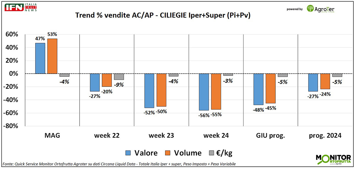 Giugno è storicamente il mese di picco nelle vendite di alcune categorie primaverili-estive, come ciliegie e albicocche, ma i dati delle prime settimane del mese nel 2024 non mostrano risultati soddisfacenti.