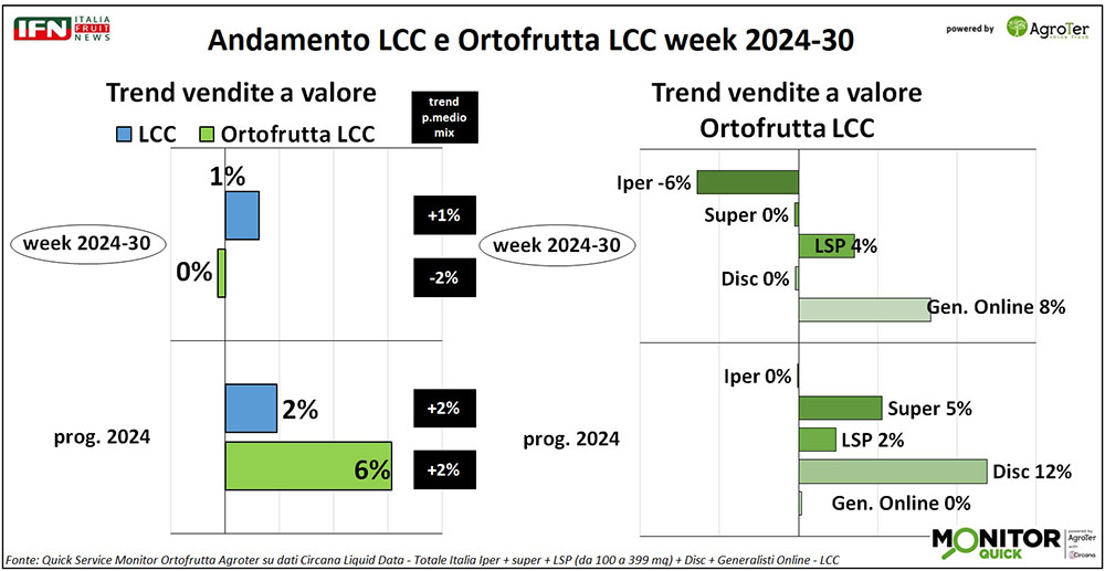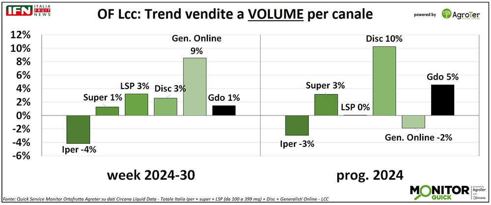 La trentesima settimana non mostra particolari cambiamenti per l’ortofrutta Lcc rispetto alla precedente. Le vendite a valore tentennano, nonostante il rallentamento della deflazione, e anche i trend a volume si ridimensionano. A livello di canali, ancora discount in difficoltà, mentre rispuntano libero servizio e online. Luglio è il mese di picco delle vendite per la frutta pronta, categoria interessante in ottica del servizio, ma critica nella gestione. I trend sono positivi, ma analizzando lo share di vendita tra i canali si nota qualche sorpresa. La week 30 chiude il mese di luglio in questa estate torrida, almeno nelle ultime settimane, e l’ortofrutta a peso imposto non raggiunge ancora il pareggio nelle vendite a valore, nonostante una deflazione sempre più ridotta (-2%, -4% nella settimana passata).