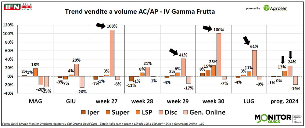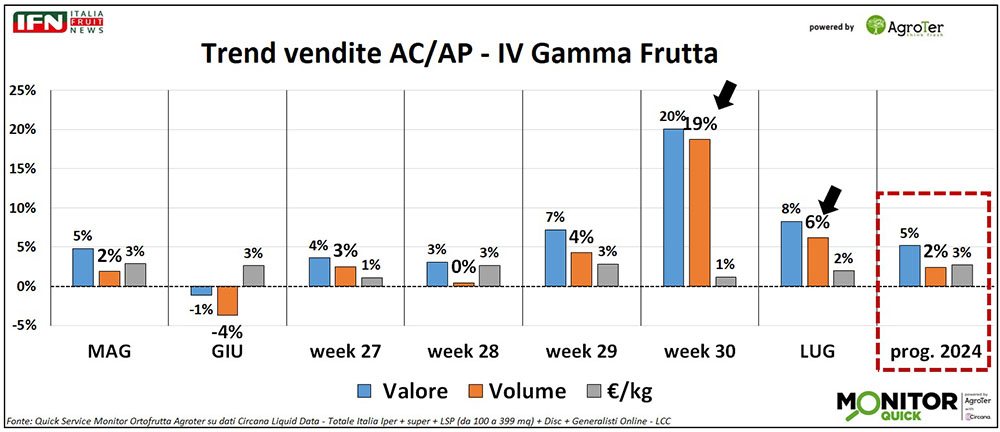 A luglio la frutta di IV Gamma raggiunge il picco di vendite annuali e il risultato del progressivo alla week 30 è tutto sommato positivo (+2% a volume, +5% a valore). Analizzando le vendite a ritroso per qualche mese, si registra un maggio in media col progressivo (+2% a volume), ma una scivolata a giugno (-4%); tuttavia, la frutta pronta registra una ripresa a luglio (+6%), con picchi del +19% nell’ultima week rilevata.