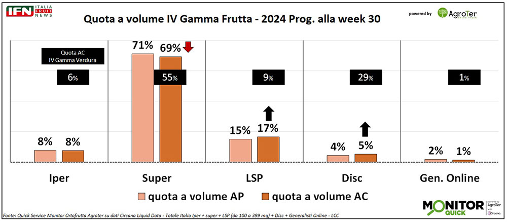 Parallelamente, i discount rappresentano il canale fisico con la quota minore nella frutta di IV gamma, il che facilita la registrazione di trend in forte crescita (in questo caso, significativa). Come si evince dalle quote, da un anno all'altro, stanno recuperando nella frutta pronta (dal 4% al 5%), ma il divario è ancora evidente, con un enorme margine di miglioramento, soprattutto considerando la quota della IV gamma verdura (29%), che li vede come il secondo canale più importante, distanziando gli altri di misura. Se osserviamo il libero servizio, invece, è evidente che sia il format più brillante nella frutta pronta: come quota a volume (17%, in crescita rispetto al 15% dell'anno scorso), è il secondo, dopo il supermercato, con una netta differenza rispetto alla IV gamma verdura (9%). Inoltre, come già notato, i trend sono in crescita a doppia cifra. Di certo, la capillarità geografica, con posizionamenti in numerose località turistiche (dove spesso è difficile trovare grandi superfici), è un elemento che facilita molto le vendite di frutta pronta, categoria che in estate incontra sempre di più il favore dei clienti.