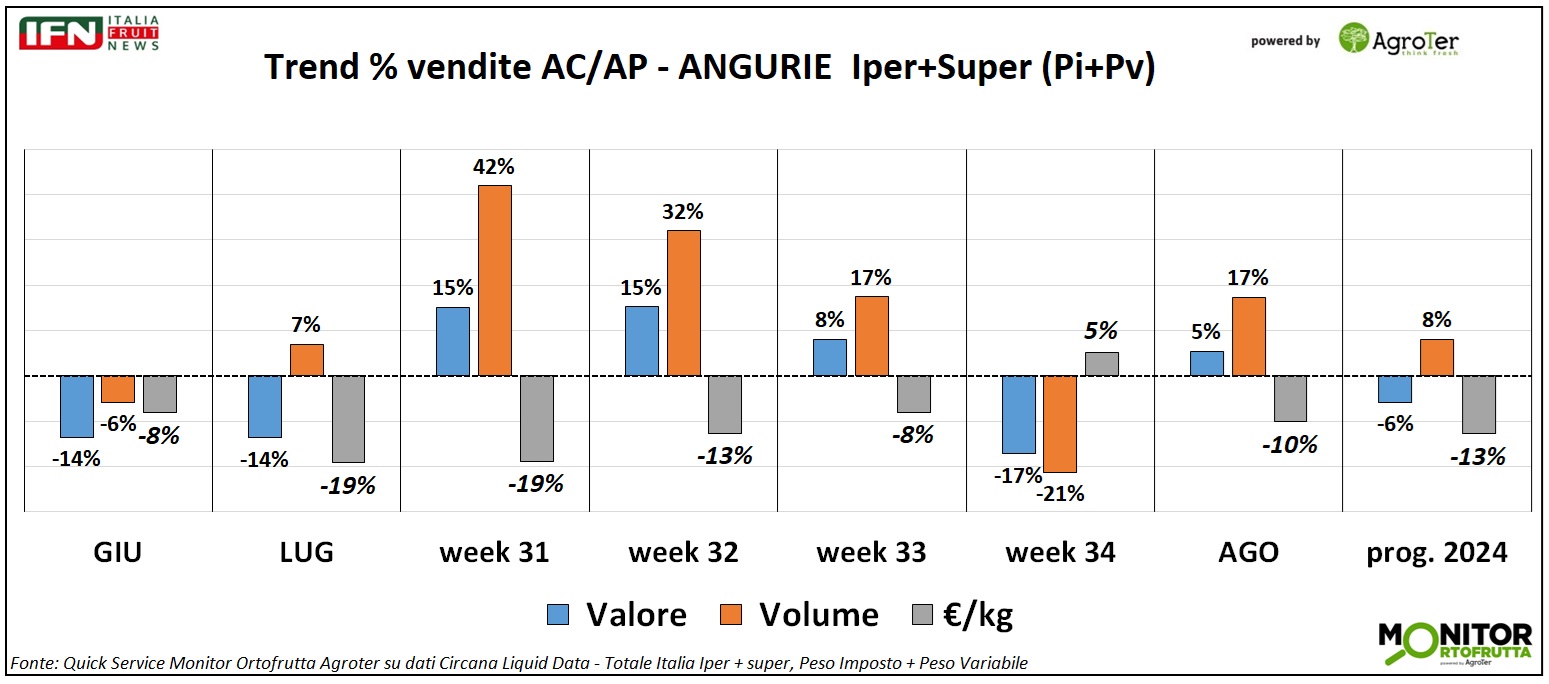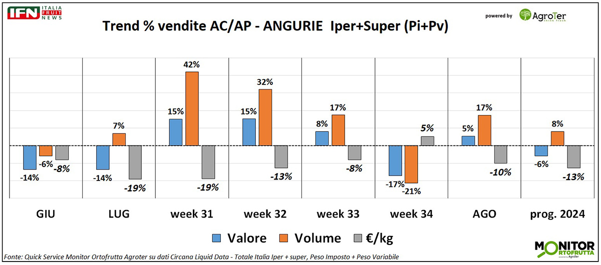Tra le categorie, le angurie registrano buoni volumi di vendita, ma il calo del prezzo medio mix incide negativamente sugli incassi.