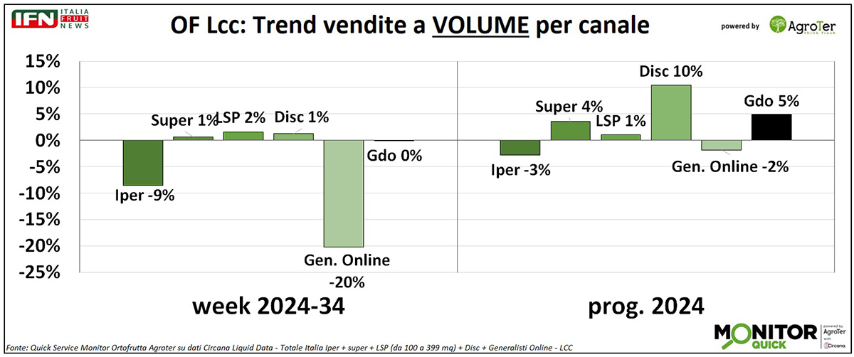 La settimana 34 segna la fine di agosto e vede un rallentamento nelle vendite di ortofrutta a peso imposto, con una diminuzione del 3% rispetto a un mese complessivamente positivo. Anche il prezzo medio mix scende dello stesso valore (-3%). Il Largo Consumo Confezionato (LCC) subisce una contrazione più lieve (-1%), nonostante un incremento del prezzo medio mix (+3%).