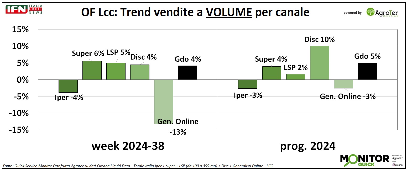 Nella settimana 38 l’ortofrutta LCC cresce nelle vendite a valore, con un prezzo medio mix stabile. A livello di canale, spicca il supermercato, mentre l’ipermercato affonda ancora. Tra le categorie orticole, il finocchio mostra un’estate frizzante in termini di vendite, ma l’inizio del mese di settembre coincide con un ribaltamento del trend a volume.