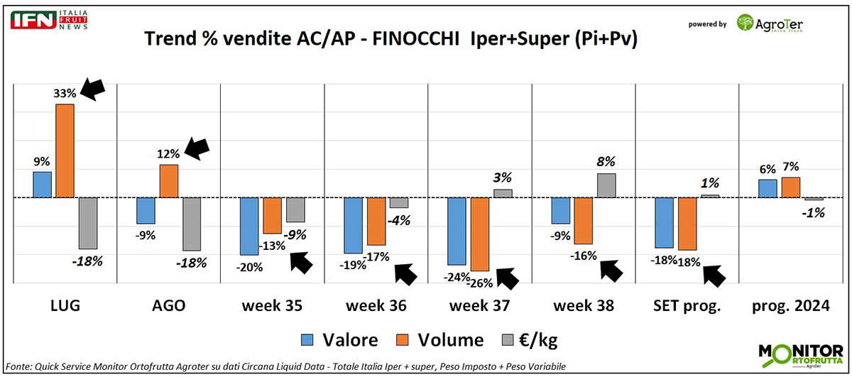 Tra le categorie più importanti all’interno delle verdure, quella dei finocchi presenta i trend di vendita più preoccupanti a settembre: dopo un luglio e un agosto sensibilmente in crescita nelle vendite a volume (rispettivamente +33% e +12%), nelle prime quattro settimane di settembre le quantità vendute vanno a picco, con trend in doppia cifra negativi e pari al -18% nel progressivo a settembre.
