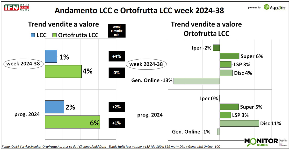 Con la trentottesima settimana, la prima autunnale del 2024, ci si avvicina alla fine di settembre. Le vendite a valore dell’ortofrutta a peso imposto risultano in crescita del 4%, con un prezzo medio mix che non mostra variazioni; parallelamente, il Largo Consumo Confezionato cresce in modo più debole (+1%), ma con dei prezzi medi in netta ascesa (+4%).