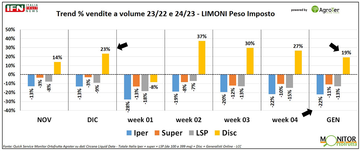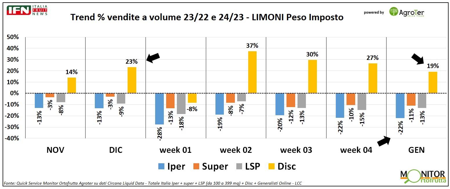 Tra le categorie del reparto ortofrutta, i limoni stanno mostrando una preoccupante diminuzione dei volumi venduti anno su anno, confermata a gennaio. Anche in questo caso, solo il discount sta registrando vendite positive.