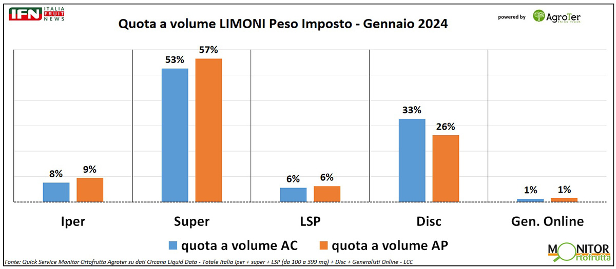 Questo exploit, nel primo mese del 2024, scombina gli equilibri di vendita da un anno all’altro: per i discount la quota di volumi di limoni venduti – infatti – è stata pari al 26% nel 2023, ma nel 2024 passa a ben il 33%, erodendo quote principalmente al supermercato (da 57% a 53%) e, parzialmente, anche all’ipermercato (9%, 8%).