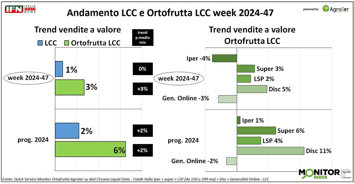 Nella settimana 47, le vendite di ortofrutta LCC registrano una crescita, ma l’aumento del prezzo medio mix maschera volumi sostanzialmente fermi. Tra i canali di vendita, il discount torna a crescere, mentre la Gdo mostra segnali di difficoltà nelle quantità vendute. Per quanto riguarda le categorie, si conferma un fine stagione negativo per l’uva, a causa di un anticipo produttivo anomalo.