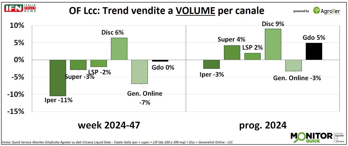 Analizzando i diversi canali di vendita per l’ortofrutta LCC, si osservano trend negativi a volume in quasi tutti i casi, con l’eccezione del discount, che segna un +6% a volume e un +5% a valore; questi trend sottolineano un calo del prezzo medio mix, in controtendenza rispetto all’aumento generale del resto dei canali. Tra questi, in maggiore difficoltà spiccano gli ipermercati, che subiscono una flessione significativa delle vendite a quantità (-11%), confermando un anno particolarmente complesso per il reparto. Supermercati (-3%) e libero servizio (-2%) mostrano cali più contenuti, soprattutto considerando i trend positivi registrati nelle settimane precedenti.