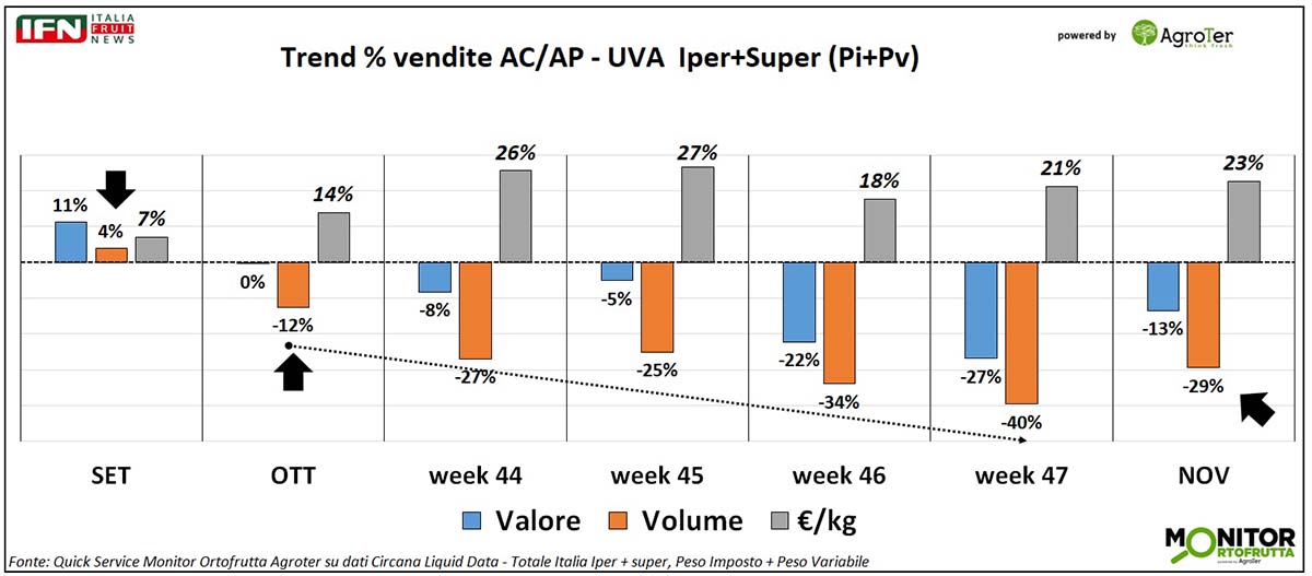 Questi risultati confermano i timori emersi a inizio campagna, legati a un anticipo produttivo di quasi un mese, che ha portato a una disponibilità limitata del prodotto nelle fasi finali. Va comunque sottolineato che novembre pesa meno in termini di volumi complessivi rispetto a ottobre e, soprattutto, a settembre. Tuttavia, il risultato negativo degli ultimi due mesi considerati portano a un saldo negativo, fino ad ora, per la campagna dell’uva nel complesso ed è improbabile che dicembre possa risollevarla.