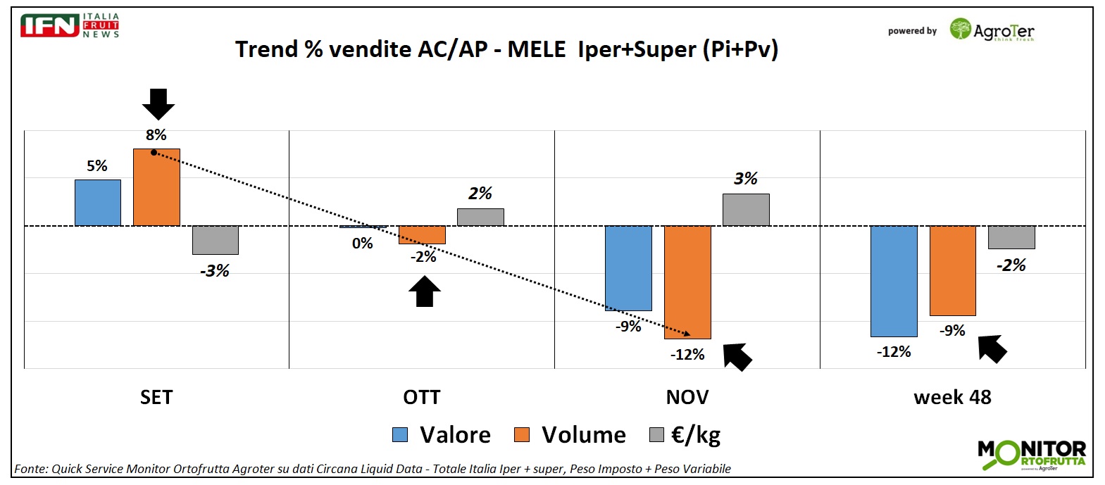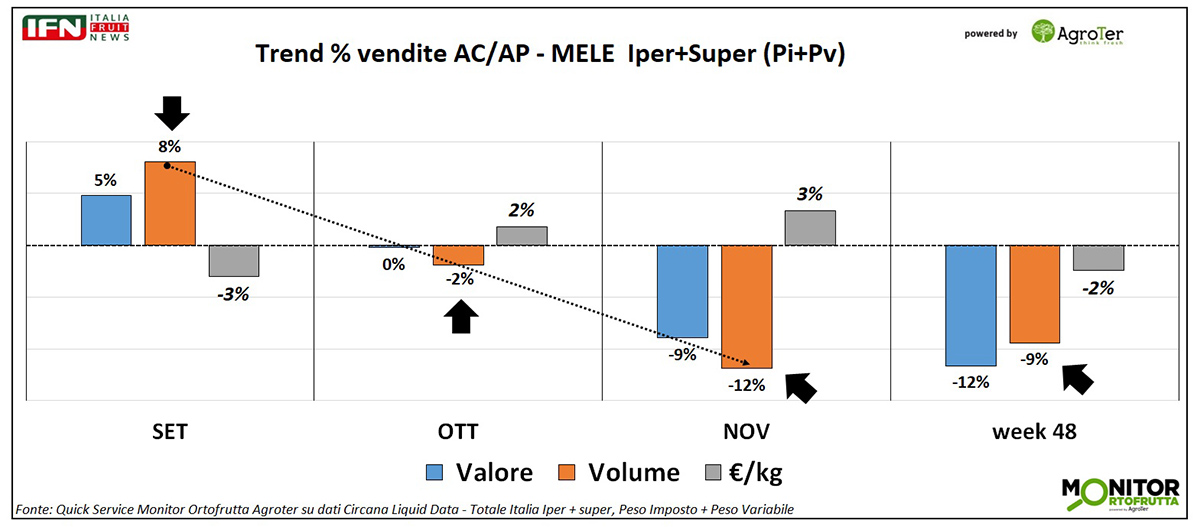Novembre e dicembre rappresentano mesi cruciali per la vendita di mele, con assortimenti che raggiungono il massimo livello di profondità. Tuttavia, le performance di ipermercati e supermercati risultano deludenti: dai trend positivi registrati a settembre (+8% a volume), si osserva un progressivo peggioramento a ottobre (-2%), che prosegue con un calo del -12% a novembre e del -9% nella prima settimana di dicembre.