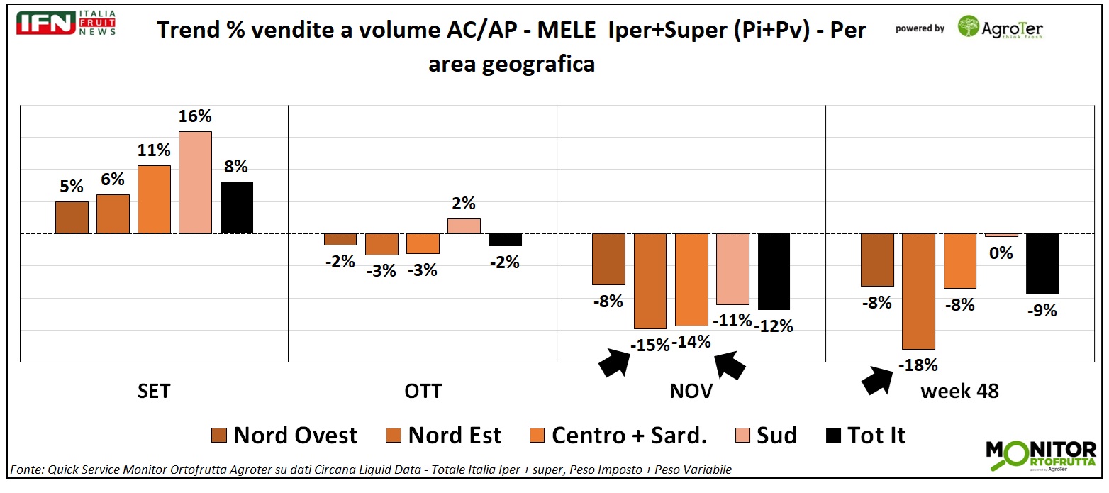 Le mele, protagoniste di questo periodo, risentono di un peggioramento dei volumi, con trend in declino a partire da settembre.