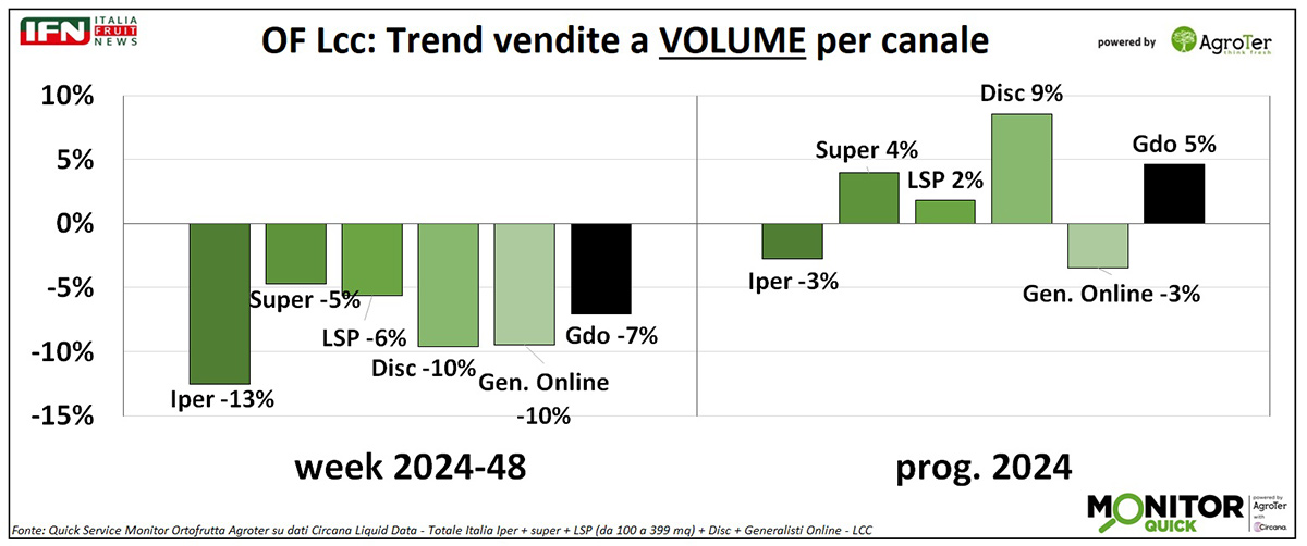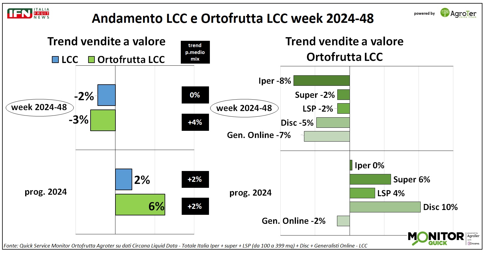 Nella settimana 48, le vendite a valore di ortofrutta LCC registrano una flessione, accompagnata da un calo dei volumi ancora più marcato, influenzato dall'ulteriore incremento del prezzo medio mix. Tutti i canali mostrano un calo nelle vendite, sebbene supermercati e libero servizio evidenzino trend meno negativi.