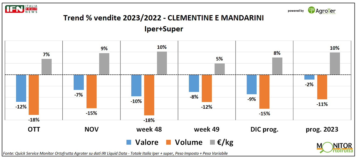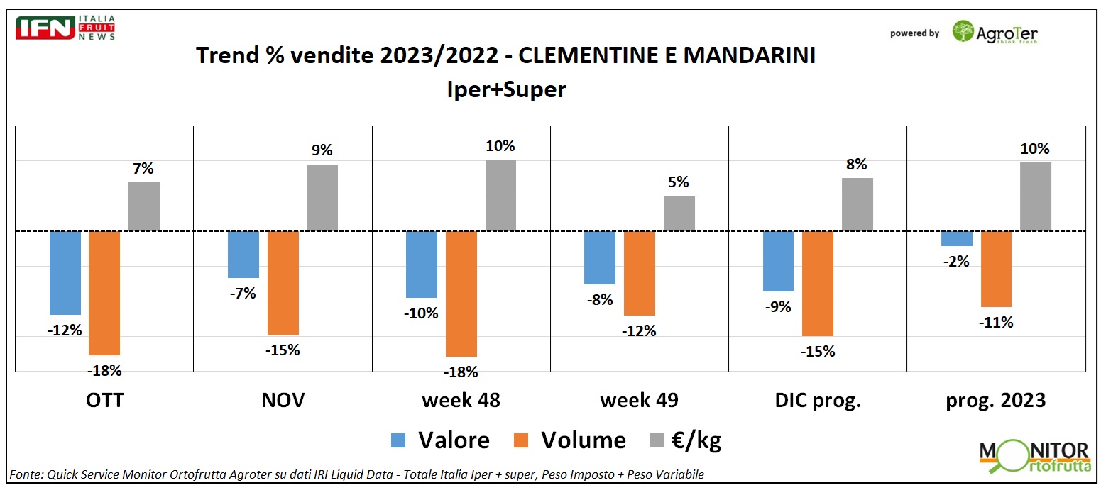 Con l’arrivo dell’inverno, una delle categorie certamente importanti nel periodo è quella di clementine e mandarini. I numeri, però, ci parlano di volumi a picco nei mesi autunnali: in ipermercati e supermercati, infatti, il trend a volume è in flessione a ottobre (-18%), a novembre (-15%) e anche nelle prime due settimane di dicembre (-15%). I prezzi medi sono in aumento mediamente di 8-10 punti, crescita che - però - non riesce a compensare le vendite a valore, in perdita anche queste ultime. Anche per clementine e mandarini, quindi, un’altra delle tante categorie in difficoltà, in quest’annata così complicata per il reparto frutta e verdura.