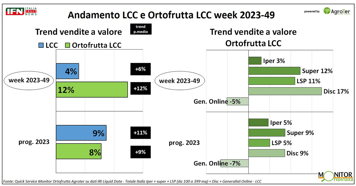Siamo quasi al giro di boa e, passo dopo passo, l’ortofrutta a peso imposto sta quasi raggiungendo l’Lcc in termini di performance nelle vendite a valore nel progressivo 2023. Le ultime settimane dell’anno sono state determinanti, con frutta e verdura Lcc che cresce a ritmi tripli rispetto al Largo Consumo Confezionato. Tuttavia, è un effetto più dovuto all’inflazione crescente che ai volumi. Tra i canali, quasi tutti quelli fisici vanno in doppia cifra, in primis il discount.