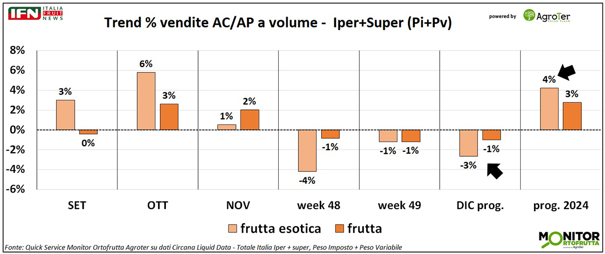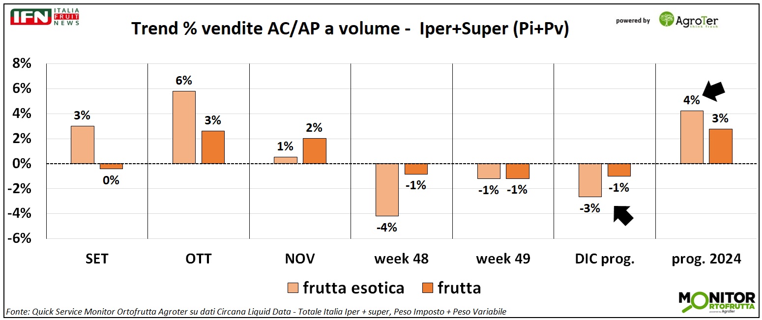 Questo potenziale risulta ancora più evidente se confrontato con il comparto della frutta, che da gennaio cresce in modo meno marcato rispetto all’esotico (+3%), pur mostrando una performance migliore nei primi giorni di dicembre.