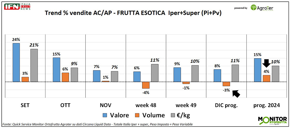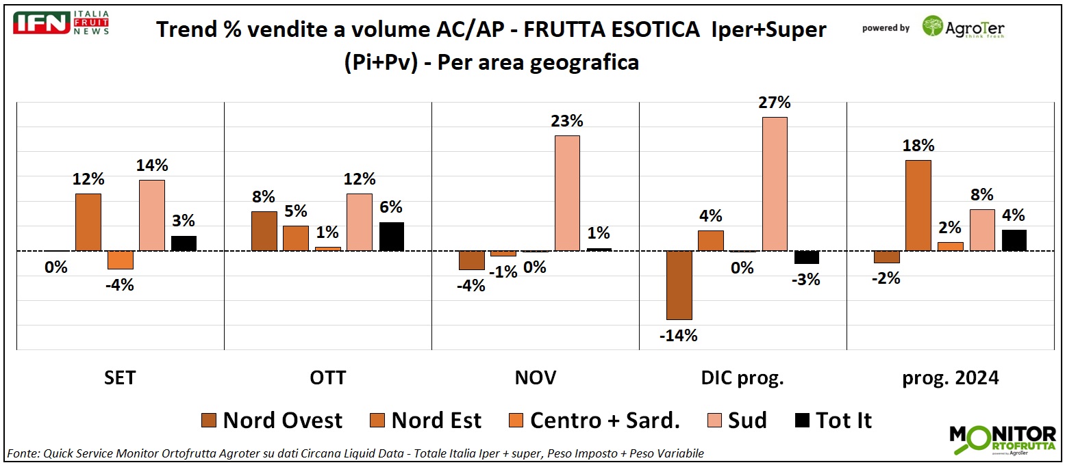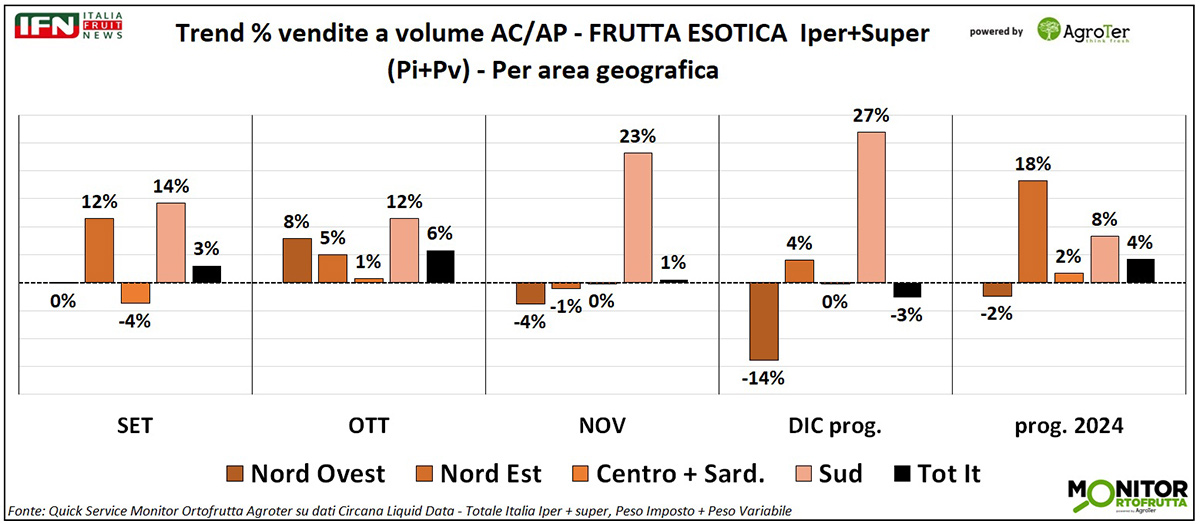 La frutta esotica fatica a dicembre, ma nel 2024 cresce più della frutta. Molto bene il Nord Est