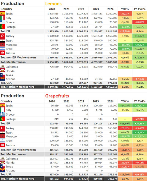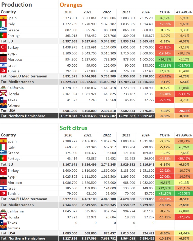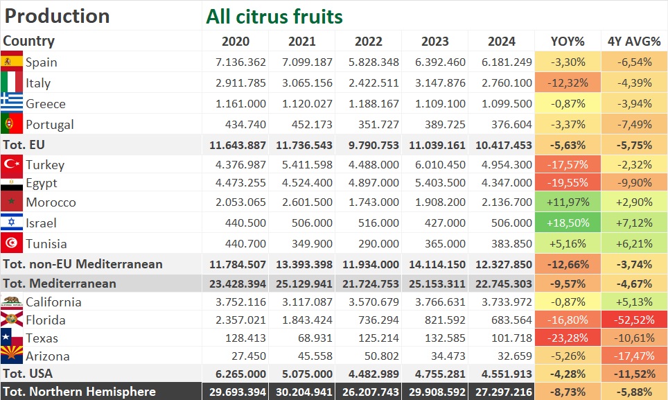 Esaminando le cifre specifiche per paese dei maggiori produttori dell'UE, la produzione di agrumi della Spagna a 6,18 MT è in calo del 3,30% rispetto alle stagioni precedenti, guidata dal calo del 21,01% dei limoni rispetto alla stagione record dell'anno scorso. Non si prevede che i drammatici eventi meteorologici in Spagna avranno un impatto significativo sulla fornitura complessiva, che nel complesso rimane come previsto. L'Italia è in calo del 12,32% a 2,77 MT, con un calo del 17,51% delle arance, mentre la Grecia rimane stabile a 1,09 MT. Negli altri paesi del Mediterraneo, la Turchia è destinata a ridurre la sua produzione del 17,57%, con 4,95 MT, dopo le cifre record della scorsa stagione. L'Egitto a 4,35 MT è in calo del 19,55% rispetto al 2023/2024. La produzione del Marocco, d'altra parte, dovrebbe crescere a 2,14 MT (+11,97%). Anche la produzione di Israele dovrebbe recuperare a 0,56 MT (+18,50%). Il Portogallo, che ha contribuito per la prima volta alle previsioni, stima un calo del 3,37% nella prossima stagione (0,38 MT in totale). La produzione negli Stati Uniti dovrebbe ridursi a 4,55 MT (-4,28%), continuando a diminuire rispetto alla media delle stagioni precedenti (-11,52%).