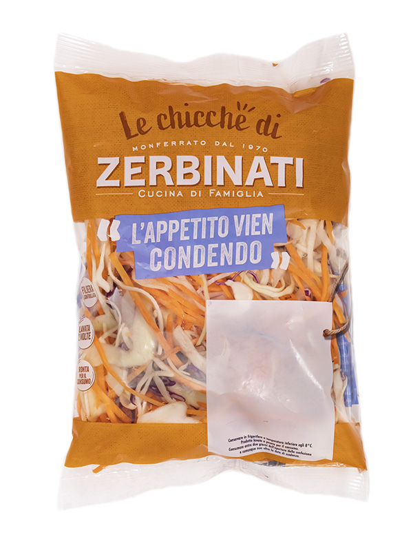 • Coleslaw delicata: Cavoli Cappuccio e Carote 200g: è l’insalata di cavolo di origine anglosassone che sta prendendo sempre più piede anche in Italia. Zerbinati la propone in versione delicata e più in linea con i gusti e consumi degli italiani, senza cipollotto nè porro. È un mix di cruditè fresco e colorato.